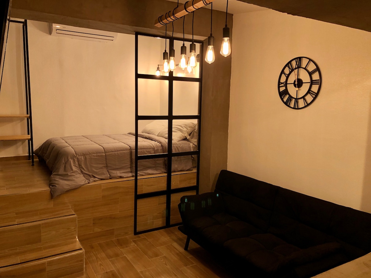 Bienvenido a tu LOFT urbano estilo cabaña! Estamos ubicados en una zona familiar y segura con una excelente ubicación. Envuelvete en nuestros modernos espacios con ese toque rústico y disfruta del clima con una agradable terraza con vista al jardín. El LOFT cuenta con cochera techada, entrada independiente y cámaras de circuito cerrado al exterior. Te encuentras a solo 12 minutos del centro histórico, y a 5 minutos de la zona más moderna de la ciudad Distrito 1.