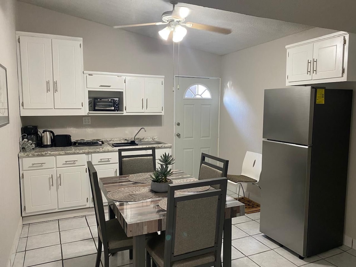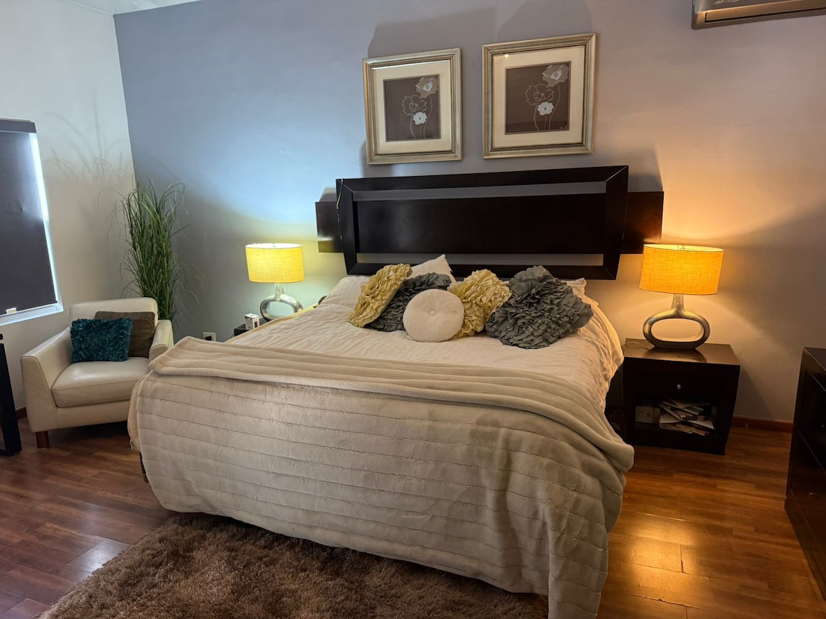 Disfruta de un espacio privado, cómodo y totalmente equipado, ubicado sobre Ejército Nacional y a solo 10 minutos del Consulado Americano y del Puente Internacional Zaragoza. Es ideal para visitantes que vienen a citas, trámites o estancias cortas en Ciudad Juárez. El espacio es perfecto para 2 huéspedes, aunque puede recibir un tercero con el sofá cama. La zona es tranquila, segura y con acceso rápido a tiendas, restaurantes, supermercados, transporte y rutas directas hacia el consulado.