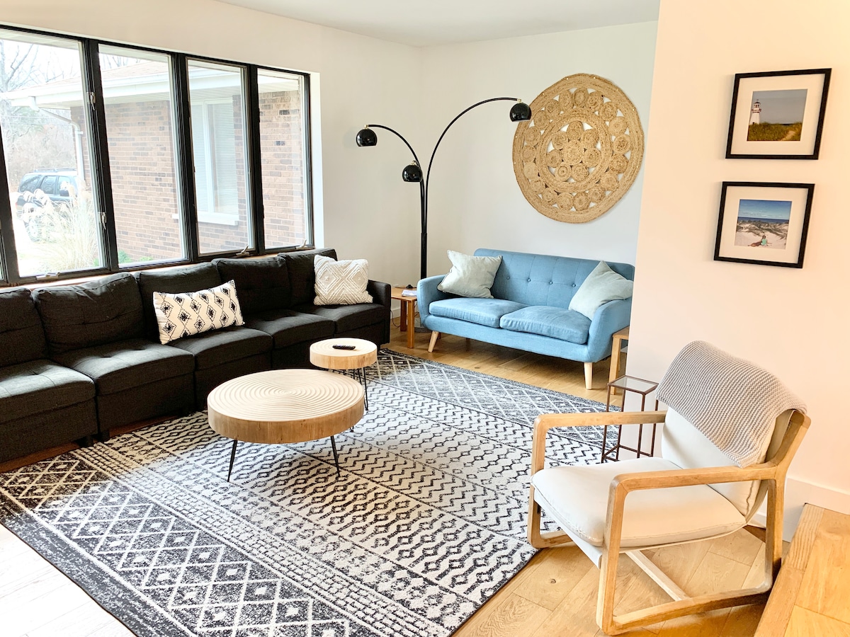 5 bedroom 2 bath 2200 sq ft modern farmstead , 2 minutes to new buffalo and beach and all its offerings , 18x36 new heated shared pool and hot tub. Property on 6 acres with plenty of room for kids to play , 26 apple trees and woods , ride host bikes to new buffalo .. Best of both worlds in country , close to town .There’s 2 new homes on 6 acre property, this home and 1 guest home ( rented separately) .