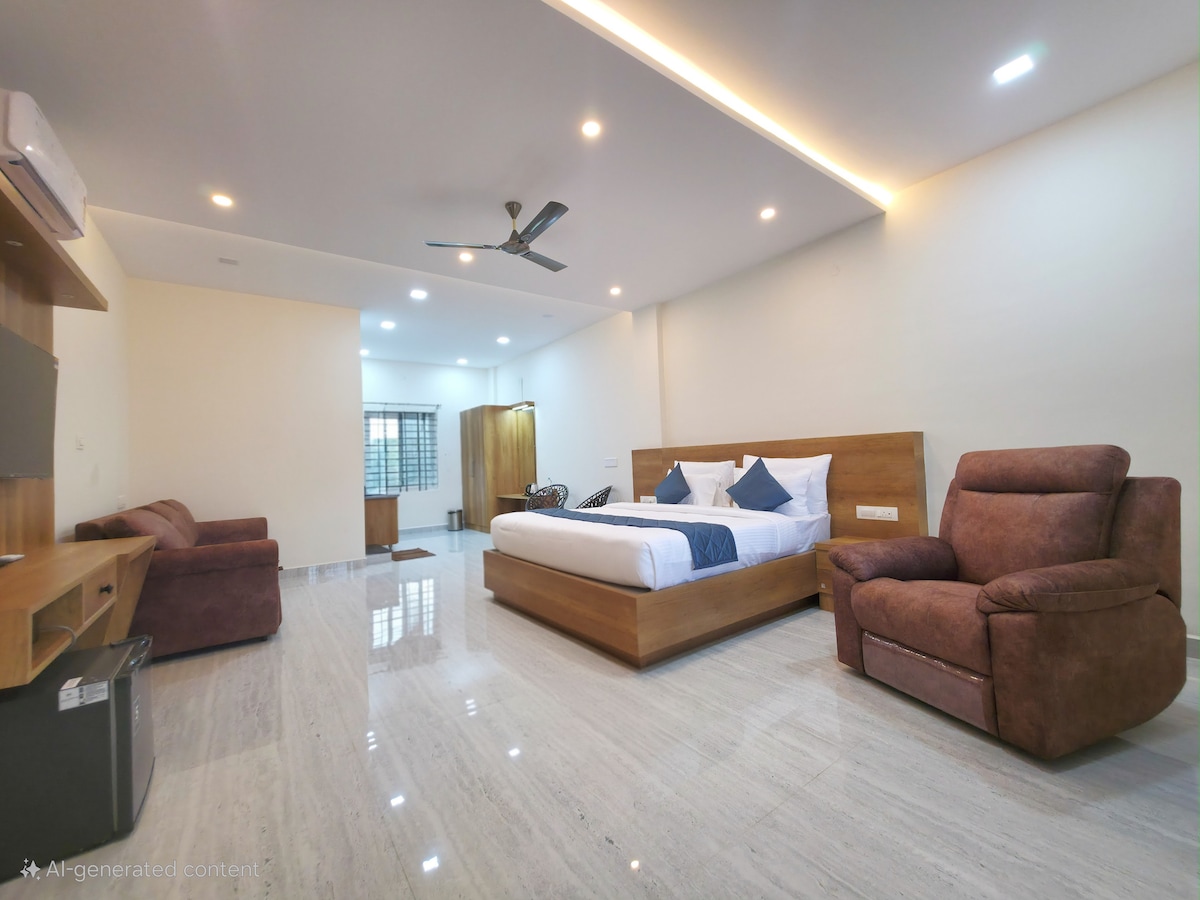 Escape to a peaceful homestay in Mudigere surrounded by coffee estates, hills, and scenic views. Enjoy cozy rooms with attached baths, Wi-Fi, ample parking, and a fun game room. Perfect for families, groups, and pet lovers. Explore waterfalls, plantations, and trails nearby, or simply unwind in nature. Parties allowed with minimal sound, quiet hours at 10 pm. Caretaker on site for a comfortable, worry-free stay.