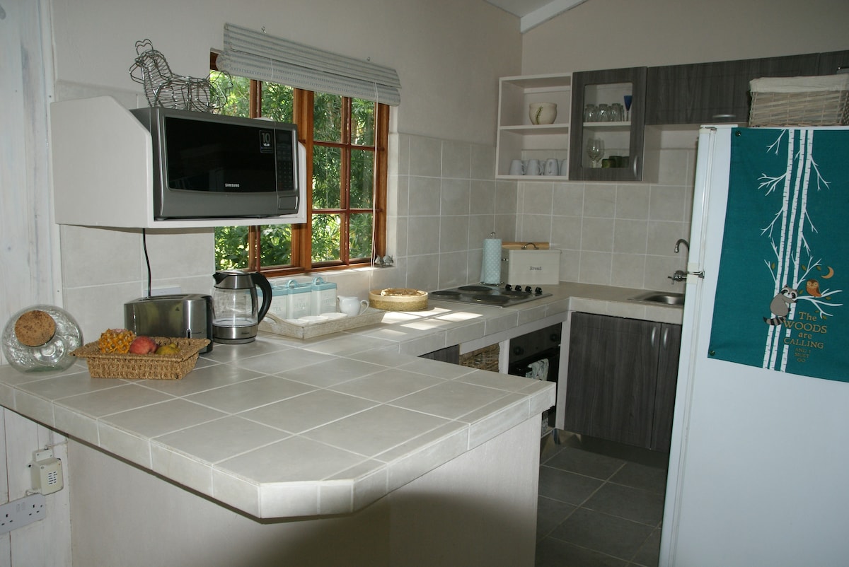 Spacious one bedroomed cottage. Open plan kitchen lounge with a breakfast bar. Fully equipped kitchen with a washing machine; and bathroom with bath and shower. Comfortable king size bed with mosquito net and ceiling fan. Plenty of storage areas. Small trundle bed for families with a child and extra mattresses are available if requested. Parking available in car port.