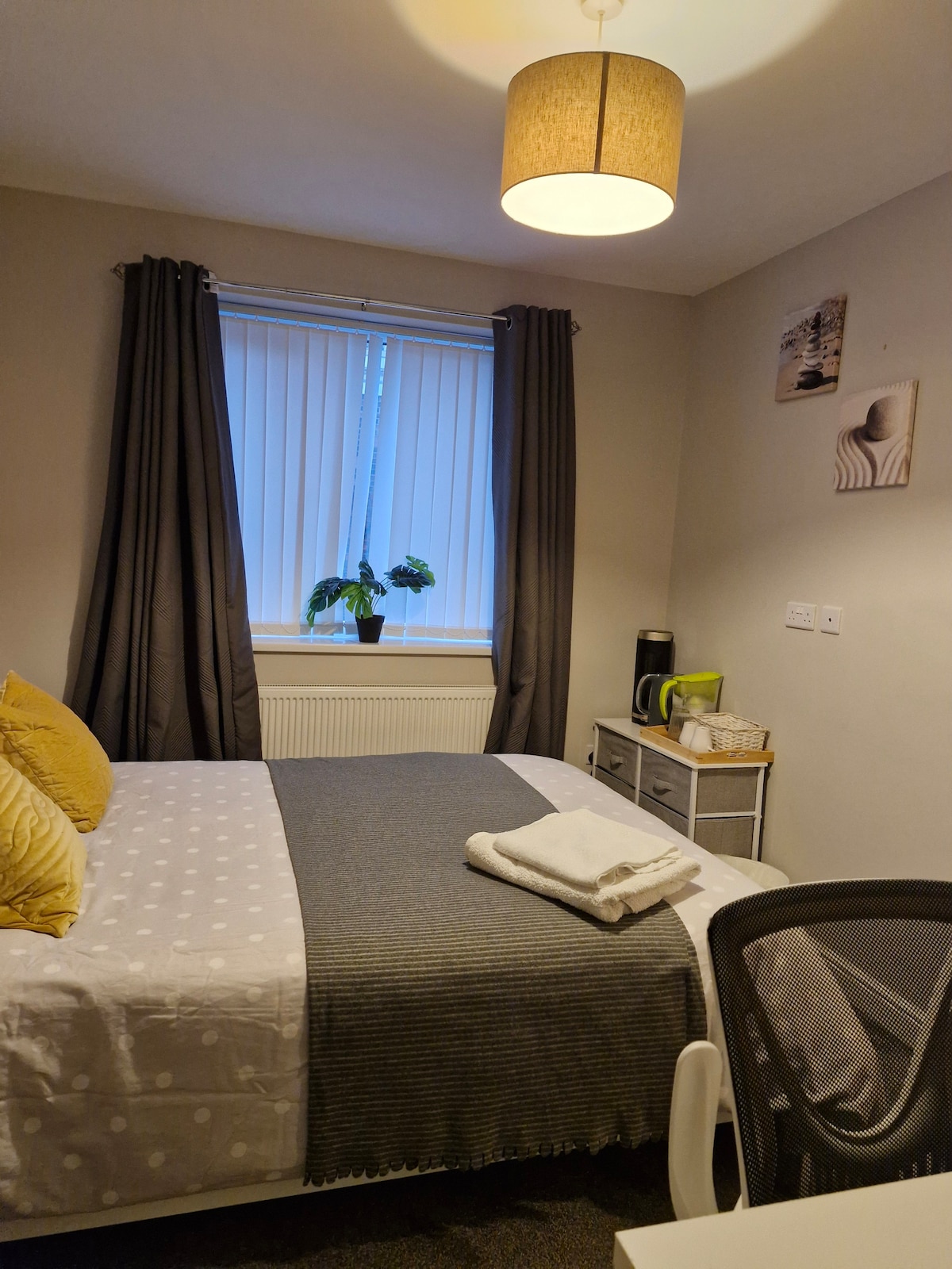 3 bedrooms and 2 bathrooms + spacious living room and separate kitchen Off street parking for 2 vehicles (visible from the lounge) This bright and stylish 3-bed flat offers a comfortable base for guests working locally, visiting family, or exploring the area. Refurbished in 2024, the space is modern, practical, and designed for longer or short stays alike. With generous bedrooms, a fully equipped kitchen, and onsite parking for two vehicles, it’s an easy and relaxed place to settle in.