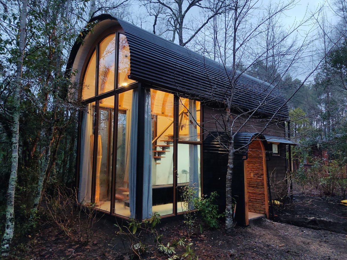 Duplex for 2. 7 mts above ground. 2 acre private park. Decks with panoramic views to infinity and a hanging bridge to let your dreams fly. Thermal insulation, double glass windows, floor heating and slow combustion fireplace. Queen size bed. Desk, Wi-Fi, full kitchen with fridge, induction top and all the necessary utensils to enjoy the stay. Full bath with a shower with amazing view, towels, hair dryer, bidet!, fire pit, bbq and parking. 6 kms from Pucón on paved road. Ran by its owners.