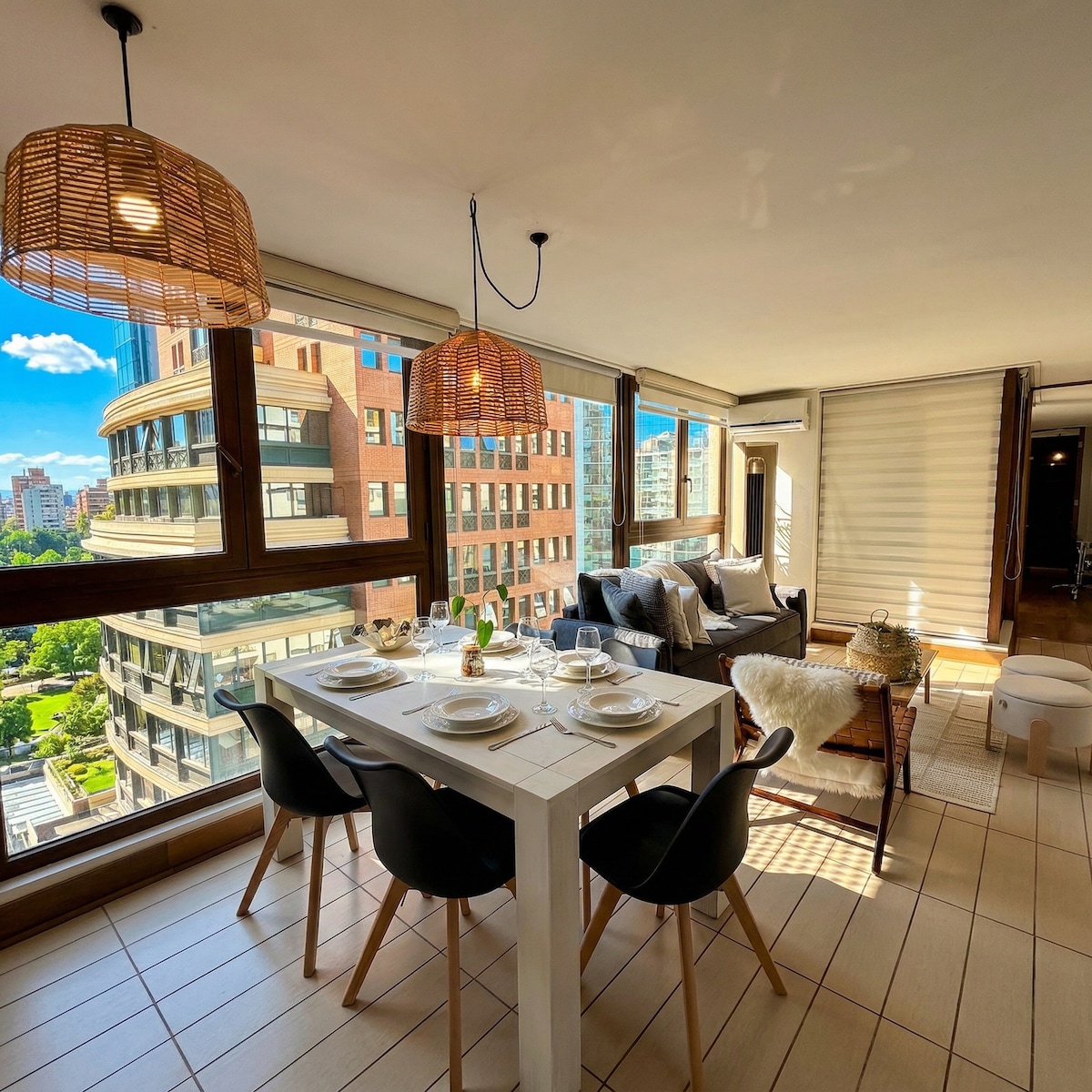 Amplio y moderno departamento con estacionamiento, wifi de alta velocidad y terraza, ideal para familias, grupos o viajes de trabajo. Capacidad hasta 5 personas, con espacios cómodos y bien distribuidos. Excelente ubicación a pasos del Metro Manquehue, supermercados, restaurantes y servicios en Las Condes.