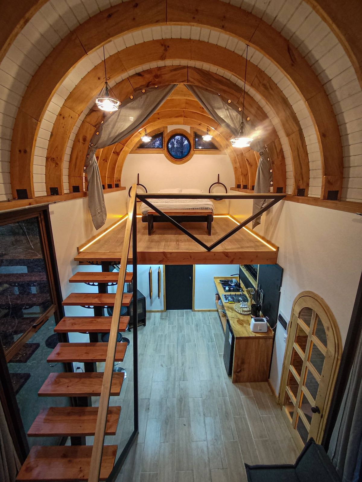 Duplex for 2. 7 mts above ground. 2 acre private park. Decks with panoramic views to infinity and a hanging bridge to let your dreams fly. Thermal insulation, double glass windows, floor heating and slow combustion fireplace. Queen size bed. Desk, Wi-Fi, full kitchen with fridge, induction top and all the necessary utensils to enjoy the stay. Full bath with a shower with amazing view, towels, hair dryer, bidet!, fire pit, bbq and parking. 6 kms from Pucón on paved road. Ran by its owners.