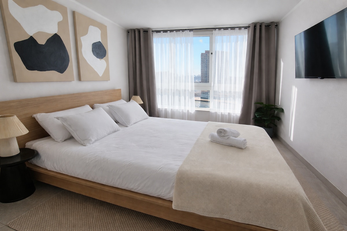 Moderno y cómodo departamento con aire acondicionado: 1 cocina independiente, 1 living/comedor, 1 dormitorio principal, baño privado y walk in closet (vestidor), 1 dormitorio secundario, 1 baño secundario diseñado para ser compartido por los residentes y 1 oficina. Televisores con streaming TV (DirecTv, Netflix, Disney, HBO, entre otros) distribuidos en los diferentes espacios. Amplios balcones protegidos por termopaneles. Piscina Estacionamiento gratuito. Cuarto de lavado de ropa.