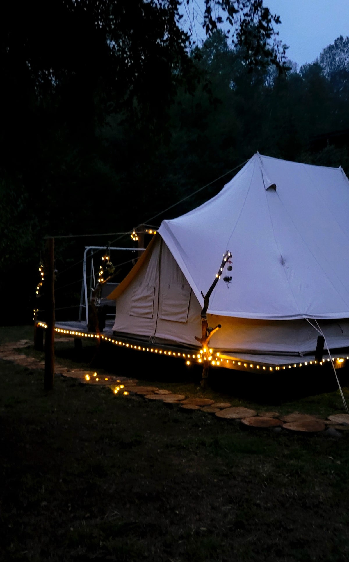 This is a comfortable and very private glamping without immediate neighbors. It is a small structure very similar to a tent. There is a double bed with linens. The platform it is on is large and has a hammock and a table and benches. There is a bathroom with a shower that has hot water nearby and an outhouse closer for middle of the night visits. You may reach us walking or by 4x4. We are happy to pick you up at the parking area. We have Starlink wifi and hot water