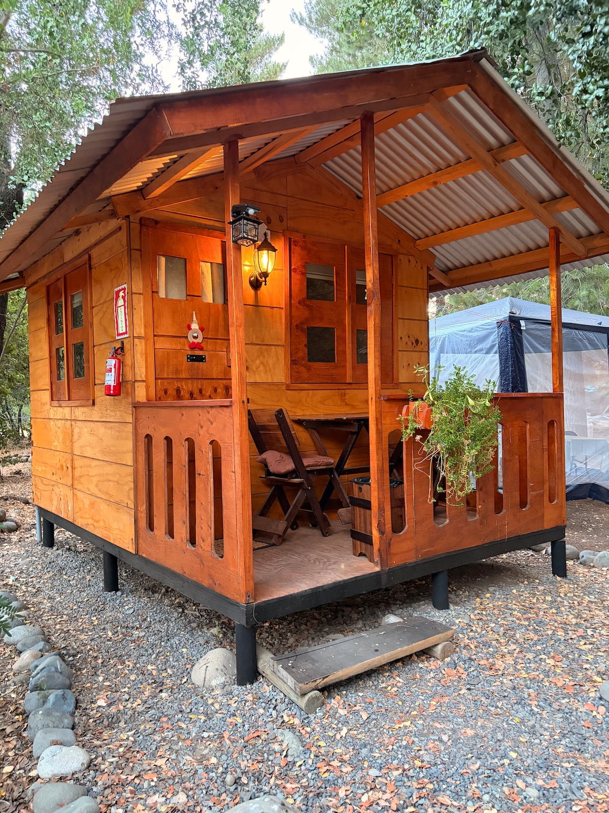 Aléjate de todo y duerme bajo un manto de estrellas, acampando con todas las comodidas de un hotel en nuestro Glamping en medio de bosques y a orilla de un río, equipado con cama de dos plazas, frigobar, ventilador y calefaccion. baño y cocina de uso comun (exterior). Disfruta de la tranquilidad de descansar en medio de la naturaleza, disfrutar del rio, rodearte de aves y conocer los arboles nativos de la zona. Estamos ubicados a solo 15 kilómetros de Villarrica.