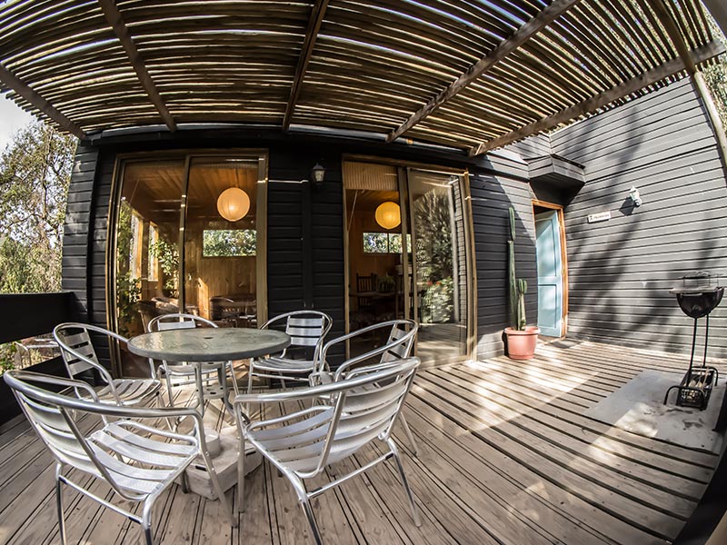 Duplex for 2. 7 mts above ground. 2 acre private park. Decks with panoramic views to infinity and a hanging bridge to let your dreams fly. Thermal insulation, double glass windows, floor heating and slow combustion fireplace. Queen size bed. Desk, Wi-Fi, full kitchen with fridge, induction top and all the necessary utensils to enjoy the stay. Full bath with a shower with amazing view, towels, hair dryer, bidet!, fire pit, bbq and parking. 6 kms from Pucón on paved road. Ran by its owners.