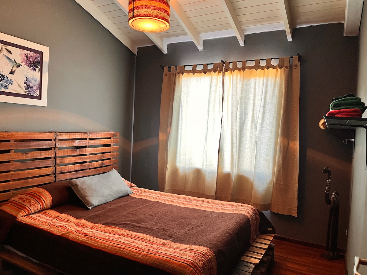 Te alojarás en una cómoda y tranquila habitación privada con baño compartido. Tendrás un rico y nutritivo desayuno. En el piso solamente hay 2 habitaciones para un total de 4 huéspedes. El baño está separado por sectores. También compartirán el uso de la cocina que se encuentra afuera de la hostería. La habitación tiene una excelente vista a la montaña donde se practica boulder. Si tienes vehículo lo puedes dejar en el estacionamiento descubierto gratuito. También tenemos guarda equipaje.