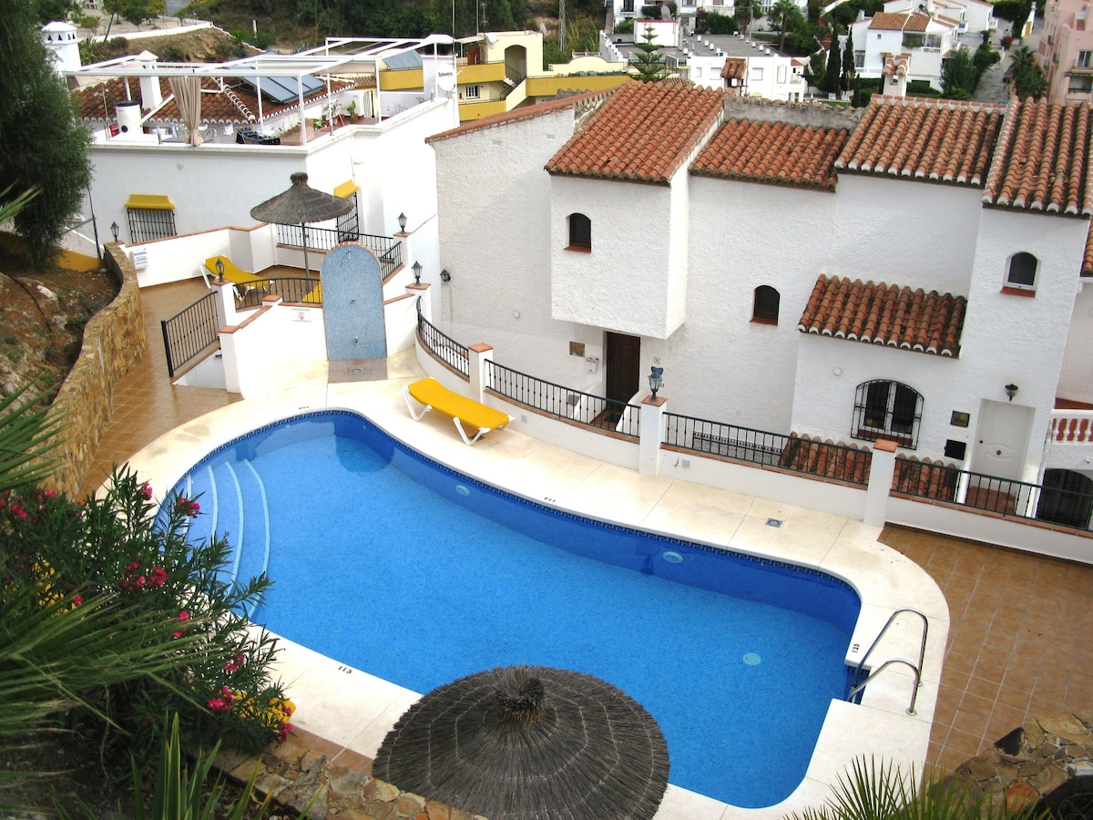 Charming Andalucian style townhouse set in mature landscaped gardens with 2 communal pools. The house is around a 5 minutes walk to Burriana and Carabeo beaches and a 10 - 15 minute walk to the Balcon and lively town centre.Within a few minutes walk from the house are a selection of shops, cafes and restaurants with a small supermarket and Tapas Restuarant immediately adjacent.