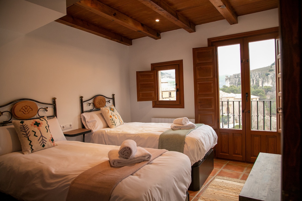 Este fabulosos alojamiento de techo con vigas vistas y 94 m2, tiene un impresionante salón-comedor y cocina totalmente equipada, comodísimo sofá-cama de 160cm por 200cm. Desde ambas habitaciones, con unos ventanales que le harán ver la magia y la imponencia de la Hoz desde una sexta planta. El alojamiento cuenta con un total de 2 habitaciones con camas de matrimonio, una de ellas con baño en suite. Asimismo el alojamiento dispone de un segundo baño completo para mayor privacidad de los huéspedes