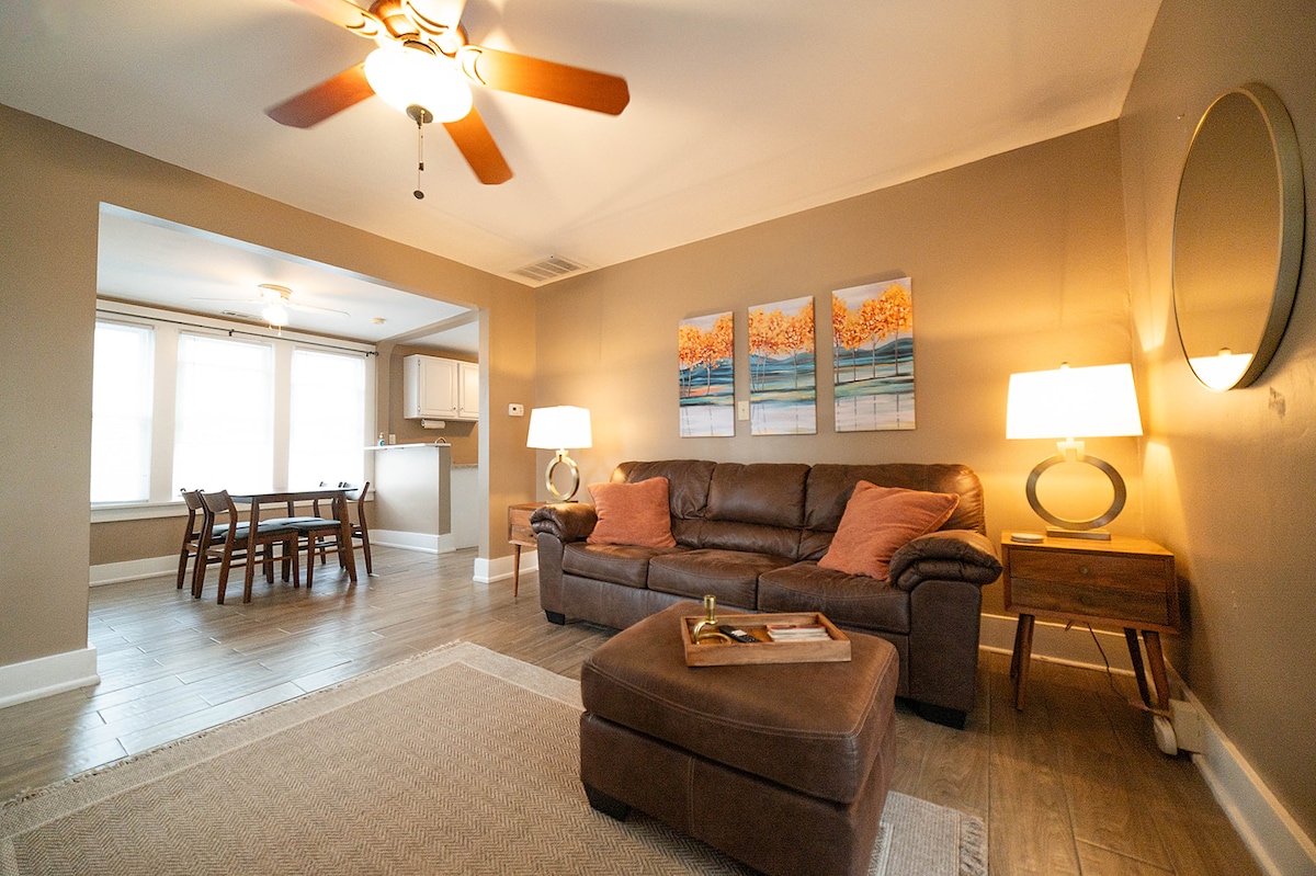Housed in the 1859 Jones Building, the Happy Place keeps the integrity of the original space with meaningful updates. High ceilings, original decorative fireplaces, newly refinished original hardwood floors and a billiards room. Located in historic uptown Circleville, just steps away from dining, the Ted Lewis Museum, Wittich's Candy Shop - the nation's oldest family owned and operated confectionary. 30 minutes to downtown Columbus and 30 minutes to the Hocking Hills and Deer Creek State Pk