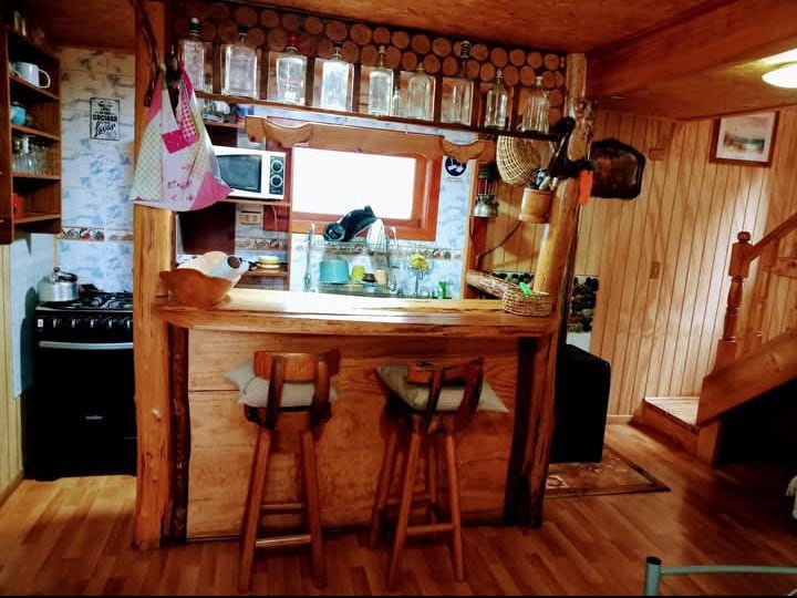 Hermosa cabaña en medio de Chiloé rural. La cabaña está situada específicamente en Teguel Bajo, una pequeña comunidad a 4,5 km de la ciudad de Dalcahue. Se trata de un lugar en medio del campo, rodeado de bosques nativos, a pocos metros del Humedal de Teguel y con una preciosa vista al canal Dalcahue. En el primer piso hay un amplio espacio en donde está la cocina, living, comedor y el hot tube. En el altillo está la habitación principal con una cama de 2 plazas.