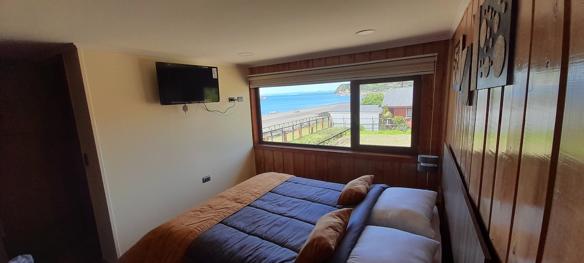 Disfruta de una amplia habitación con cama matrimonial, diseñada para brindarte comodidad y tranquilidad. Con vistas panorámicas al mar que te dejarán sin aliento, esta habitación cuenta con baño privado completo, televisión y todas las comodidades modernas. Todo esto, envuelto en la calidez y el encanto de la auténtica hospitalidad chilota.
