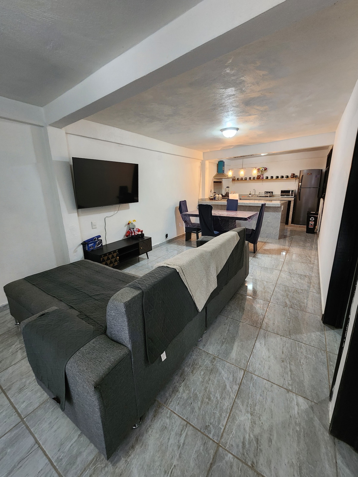 Departamento con gran comodidad, espacio y seguridad, cuenta con circuito cerrado, puerta de entrada principal automática, alarma contra robo, monóxido de carbón e incendio, excelente calidad de internet y Smart Tv. Cuenta con sistema de iluminación con 3 tonalidades: Luz blanca, semicálida y cálida, apta para el estudio y el descanso. Las escaleras centrales cuentan con pasa manos, antiderrapante, iluminación con sensor. Cocina y baño equipados. Ubicación practica con servicios disponibles.