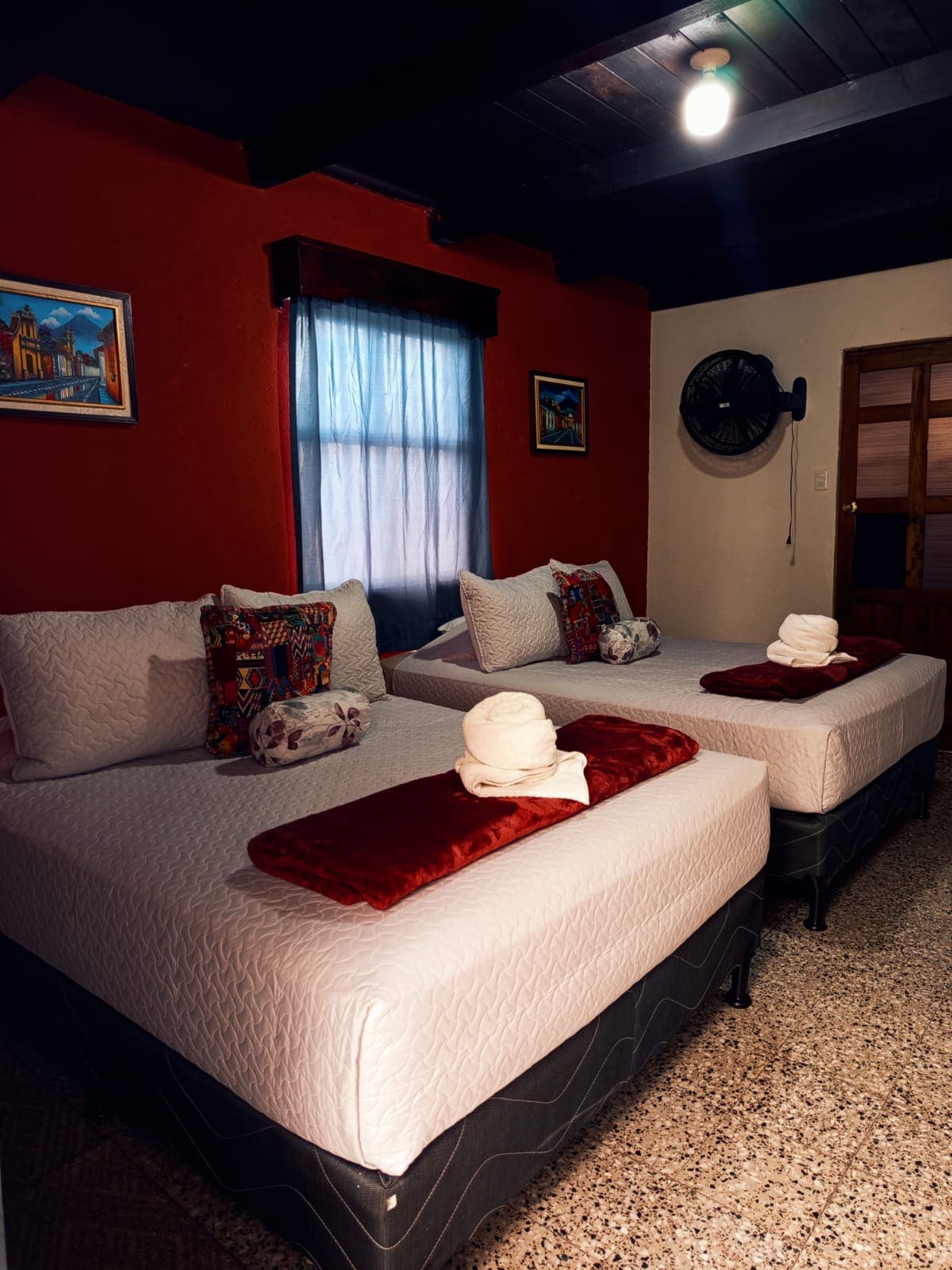 Te brindanos un ambiente agradable, donde puedes descanzar tranquilo y comodo, contamos con areas para trabajar y así disfrutar del fácil acceso a tiendas, mercados tipicos, restaurantes, bares y museos populares, desde este encantador lugar para hospedarte, dentro de la Ciudad Colonial más Hermosa de Guatemala, llena de cultura y tradición. Nota: la Habitación es para 4 personas y se remodelo, ahora tiene 2 camas matrimoniales, no cuenta con 3 camas como antes.