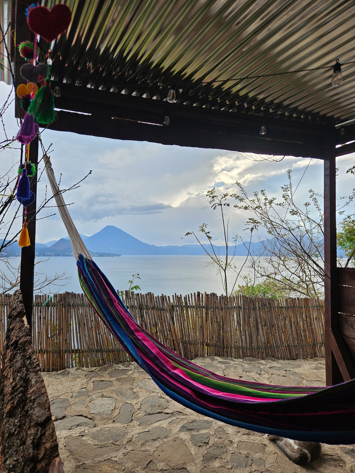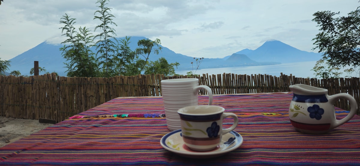Relájate en nuestra propiedad con una vista excepcional de los tres volcanes de Atitlán y Cerro de Oro, justo frente a la casa. En un área exclusiva donde podrás disfrutar nuestro jardín que te sorprenderá con flores hermosas en cada época del año y podrás apreciar la paz y tranquilidad que el lago ofrece en cada atardecer, esta es una casa rústica muy acogedora que sin duda enamora a cada visitante.
