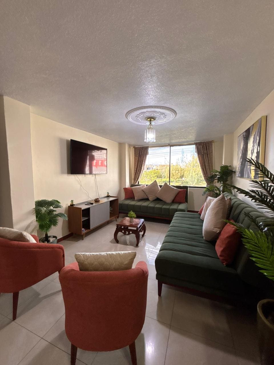 Hospedate con tu familia en el lugar mas seguro de Riobamba ubicado el del sector de máxima seguridad frente al ECU 911. - Luz 24 horas sin cortes - Espectacular Vista a la cuidad y Montañas desde balcón. - Diseño elegante 3 cuartos - A 5 min del centro. - Estacionamiento gratuito. - Maxima Hospitalidad - Lavadora y Secadora
