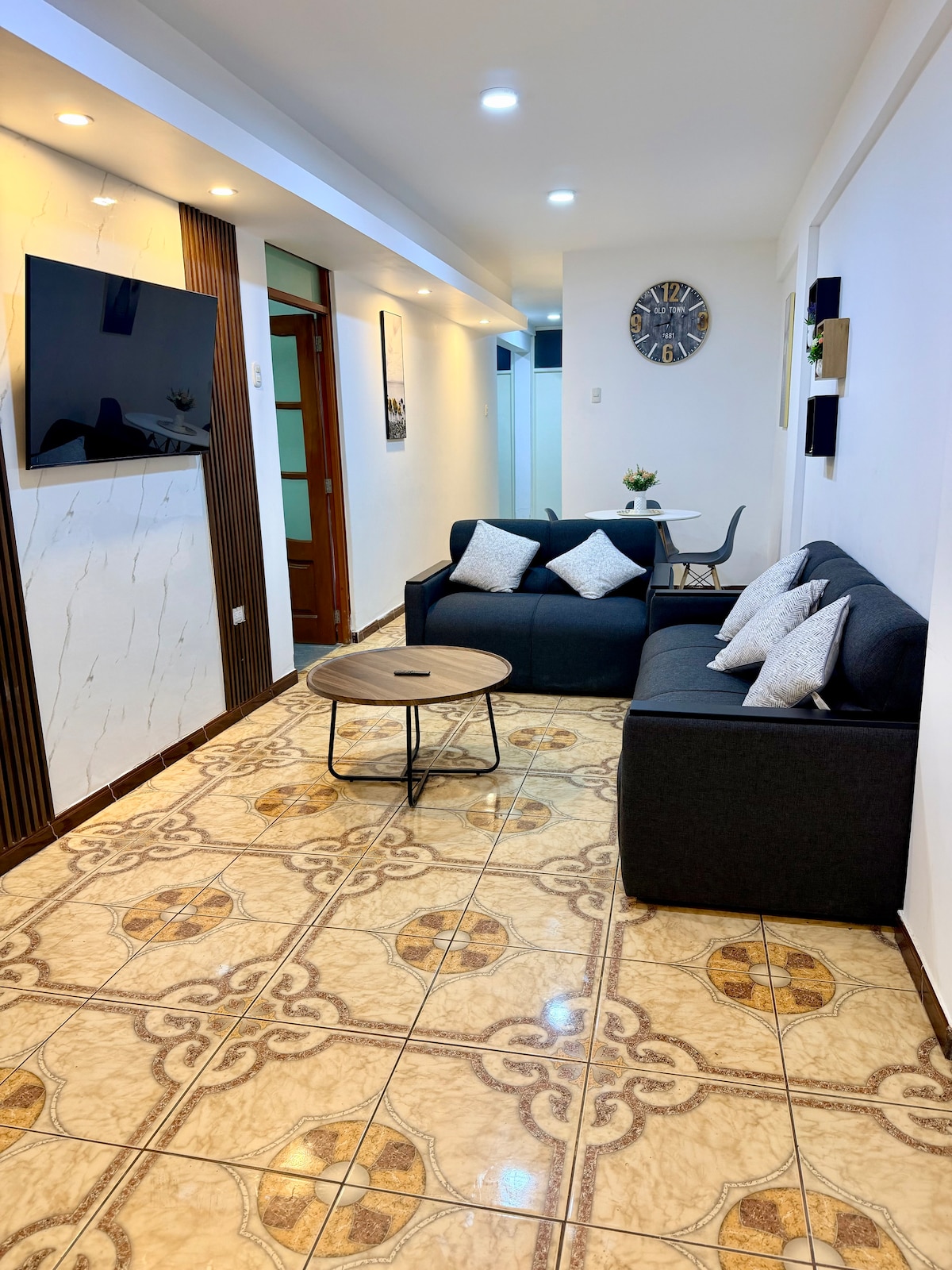 Apartamento ubicado en una zona tranquila de la ciudad de Nuevo Chimbote, a solo 2 cuadras y media del Ovalo la Familia, a minutos de la plaza mayor de la ciudad, tiendas y restaurantes , mercado. A 15 minutos de las playas Vesique, Caleta Colorada, Los Chimus, Tortugas. Relájate con toda la familia en este tranquilo lugar. TV Disney plus.