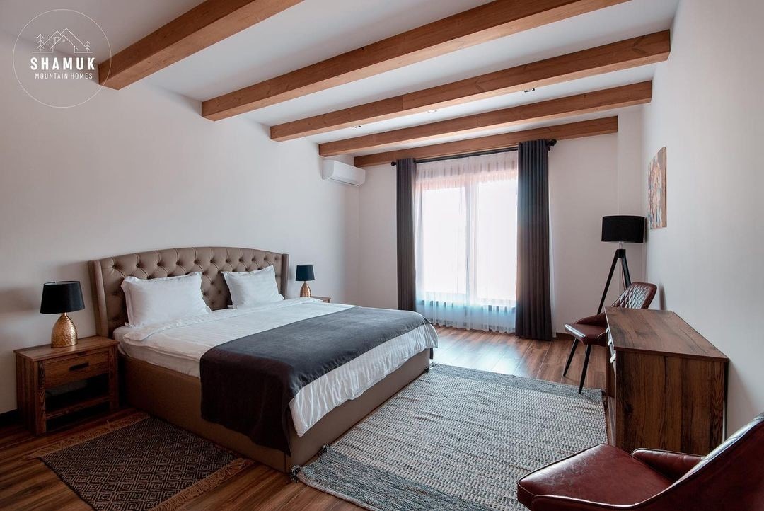 Spacious and premium penthouse apartments with panoramic view to Chimgan and breakfast included 3 bedrooms with washrooms amenities each and large living room with built in kitchen facilities. Own jaccuzi and sauna are built in This stylish place to stay is perfect for group trips.