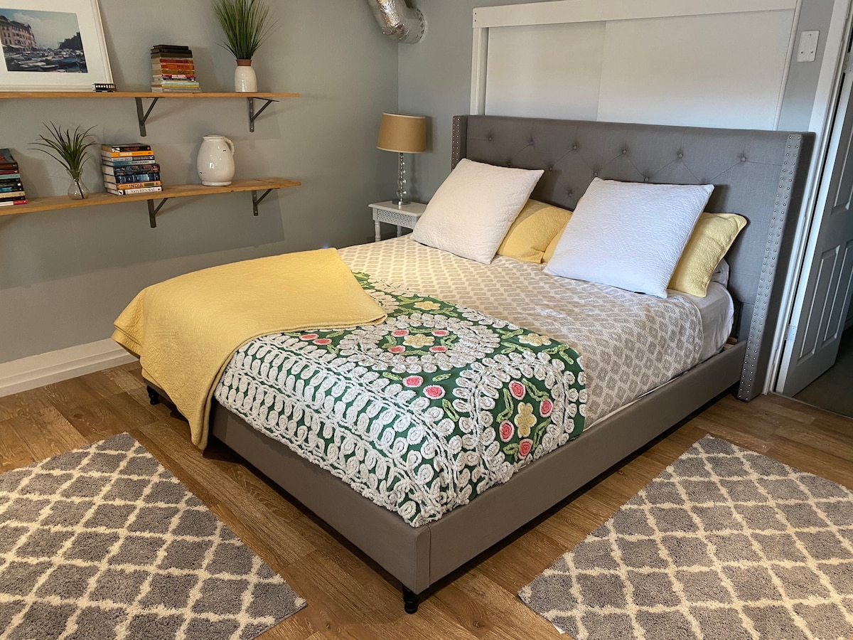 Garden Studio with a private entrance around the corner from the front door of the main house. This large studio walks out into a peaceful garden courtyard with a nice sitting area. While the suite is part of our well-maintained corner house surrounded by vegetation, your own entrance from the street makes the suite much more secluded than a room in someone’s home. Queen bed, in-suite bathroom & Breakfast bar. Quiet location.