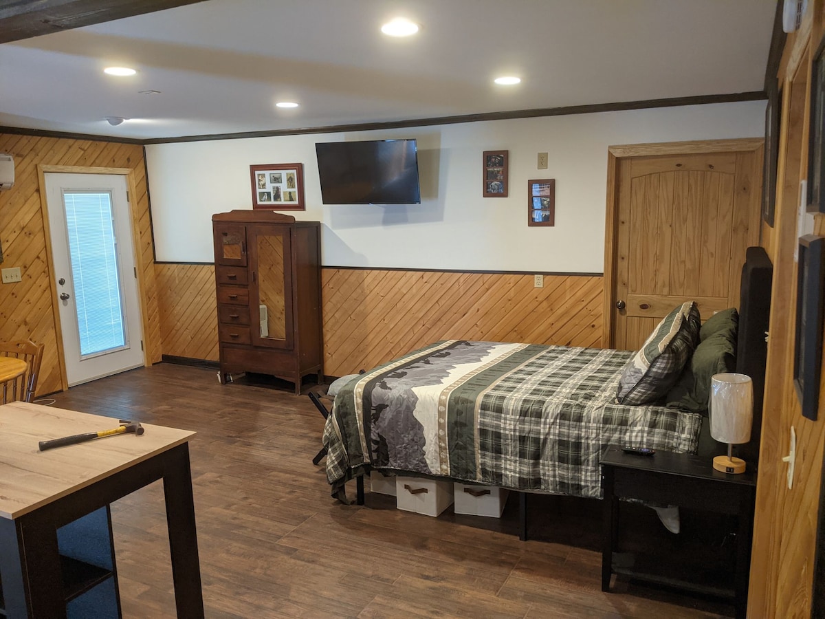 The Lodge at 7 Oaks is a private studio that is a part of our detached garage. The room offers a full kitchen, a queen size bed, a fenced in yard with an outdoor seating area with firepit. The private 6 acre property is secluded in an established neighborhood just 5 miles west of downtown Salisbury. Plenty of parking space for vehicle with trailers and RVs.