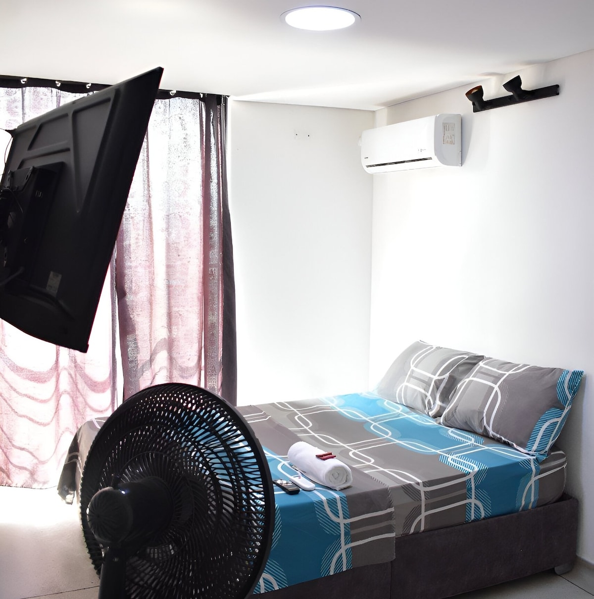 Disfruta de la sencillez de este alojamiento tranquilo y céntrico. Aparta estudio costa de 2 habitaciones en una hay sofá cama y en la otra una cama de 1.60 un solo aire el cual es compartido para las dos habitaciones, un ventilador un baño, tiene su entrada independiente. Está habilitado para 4 personas. - No tiene cocina.