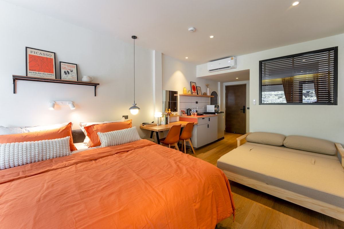 This centrally located studio apartment provides a warm, inviting atmosphere in a stylish Bangkok's mid-century setting—perfect for travelers seeking a cozy home away from home. Experience comfort and charm in the heart of the city. Be sure to check out our other listings at the same location on our profile!