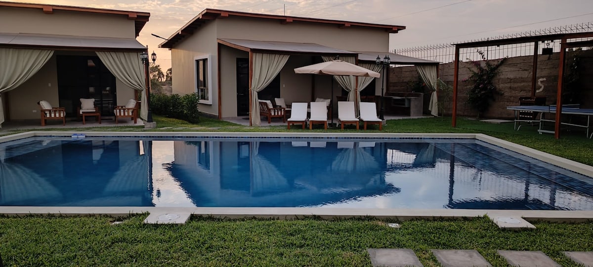 Casita Bonita, la mejor opción para disfrutar del clima de Ica, dentro del Condominio Playa del Carmen. Déjate convencer por nuestras reseñas! Piscina privada, jardín muy amplio, cocina, parrilla y fogata completamente equipadas, toallas de playa, sillas, reposeras, pelotas, raquetas, juegos de mesa, TV Smart, WiFi de alta velocidad y mucho más. Mascotas bienvenidas y cerco completo al rededor de la propiedad para que se sientan libres. Reservas de larga duración incluyen limpieza semanal.