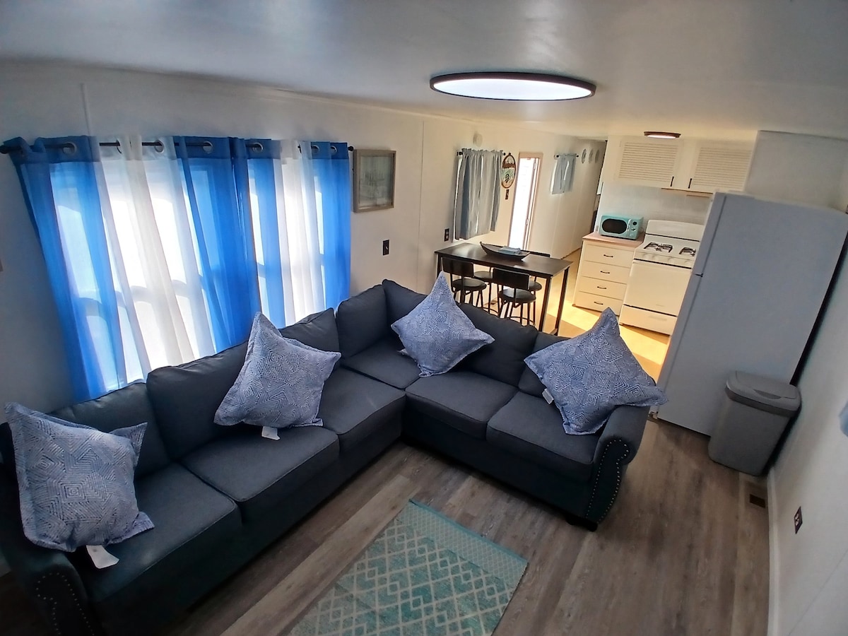 Take it easy at this unique and tranquil getaway. Open floor plan home completely renovated in 2022. Surrounded by water on 3 sides with dock access and neighbors a community beach and boat ramp. Great place for fishing, crabbing, boating, jet skiing, kayaking or just relaxing by the fire pit. 3BR 2BA with florida room surrounded by large decks, full kitchen with quartz countertops, washer and dryer, sleeps 12, 1 queen BR, 1 Full BR, Triple Bunk BR, queen Sleeper, futon, and twin roll away bed.
