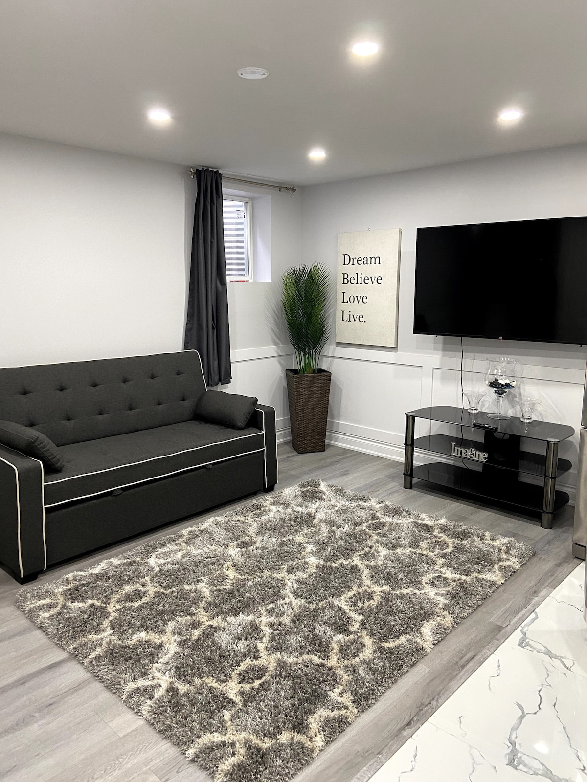 Enjoy a stylish and peaceful stay at this centrally located one-bedroom lower-level unit, perfect for both leisure and business travelers. With your private entrance, parking, and all the essentials, it’s your ideal home away from home. Features include a full kitchen, bathroom, internet, smart TV, one Queen and one sofa bed, and a functional workspace. Steps from FreshCo, Walmart, restaurants, and services. Minutes to Vaughan Mills, Canada’s Wonderland, Cortellucci Hospital and transit.