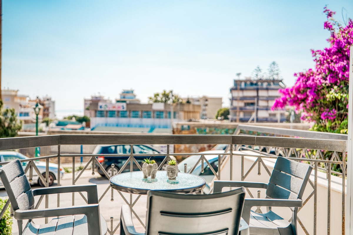 This 50 m2 apartment is designed to accommodate up to 3 guests offering an unforgettable stay with its stunning sea views and prime downtown location. It features an open plan living area, with a cozy Queen-size bed and a living room with a sofa bed separated by a bookcase. For your convenience, the apartment also includes a fully equipped kitchen, a dining area, a washing machine, a TV and a big closet. The bathroom is equipped with a shower, fresh towels, and all essential bath amenities.