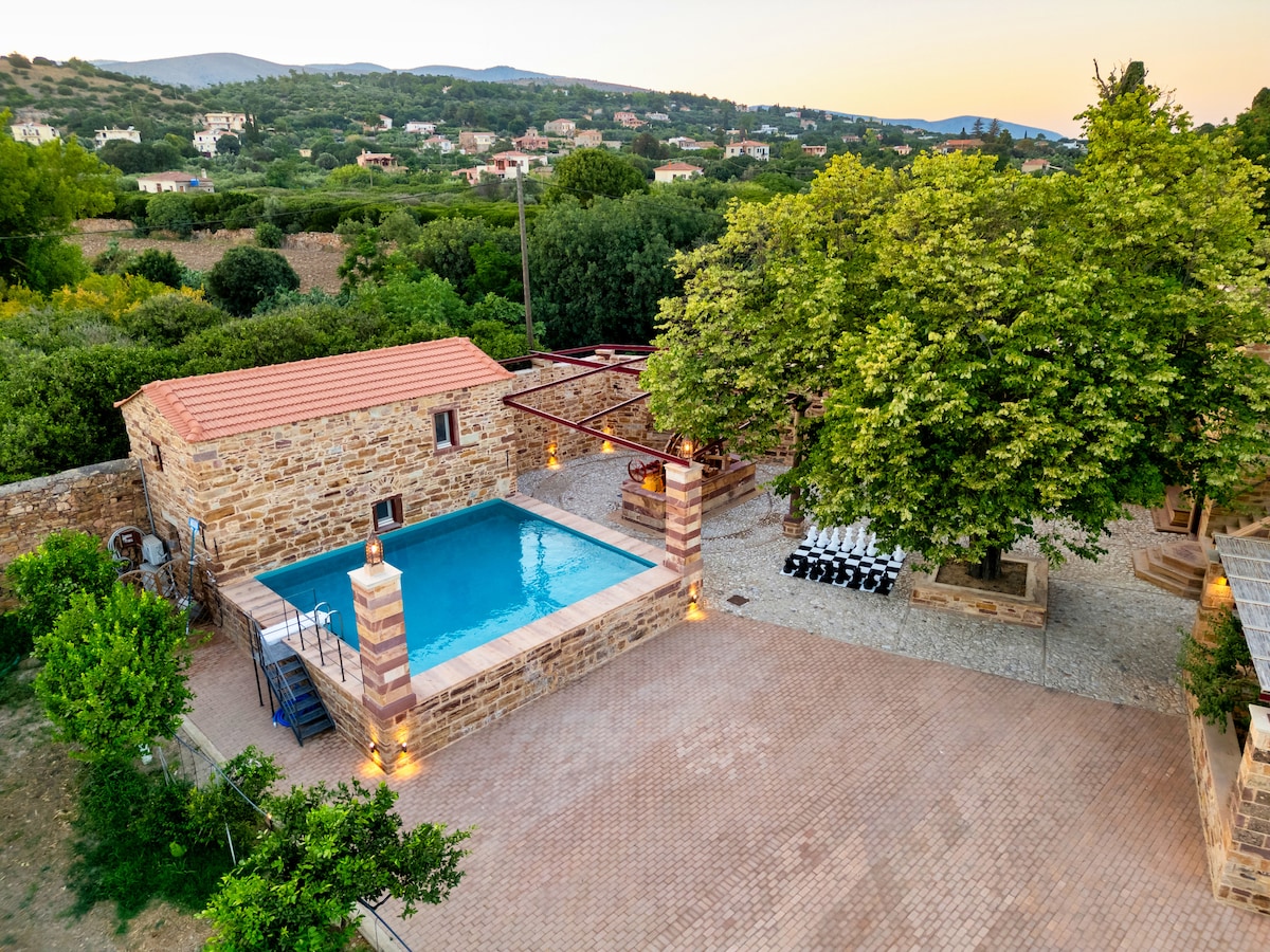 This 170 s.m., masonry wall, double-storey house was originaly constructed at 1859 and is a typical example of early neoclassical architecture, infused with local traditional elements such as the pebbled yard and the traditional terrace.
