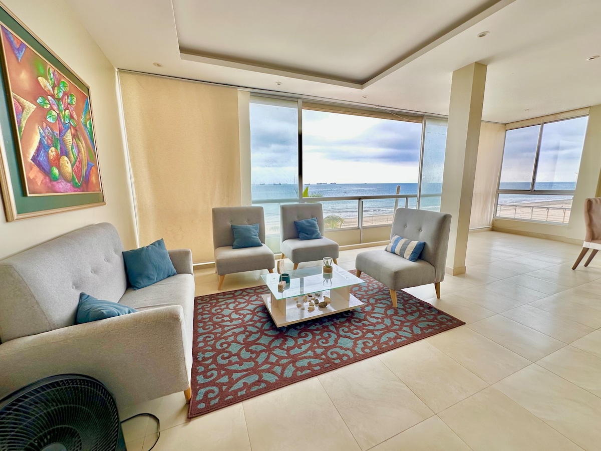 En la playa mas segura de Ecuador, CHIPIPE, departamento grande 160m2 completo en el 4to piso, junto al mar, 4 dormitorios con aire acondicionado, 4 baños totalmente nuevos, sala, comedor, cocina, lavandería, completa, equipado completamente, garaje, ascensores, para sol en la playa con sillas, cerca a todo, iglesia, chocolatera, lobería, morro, mar bravo, restaurantes, cafeterías, tiendas, jetsky, banana, paseo en bote a ver ballenas, wakeboard, etc. Solo mascotas pequeñas permitidas.
