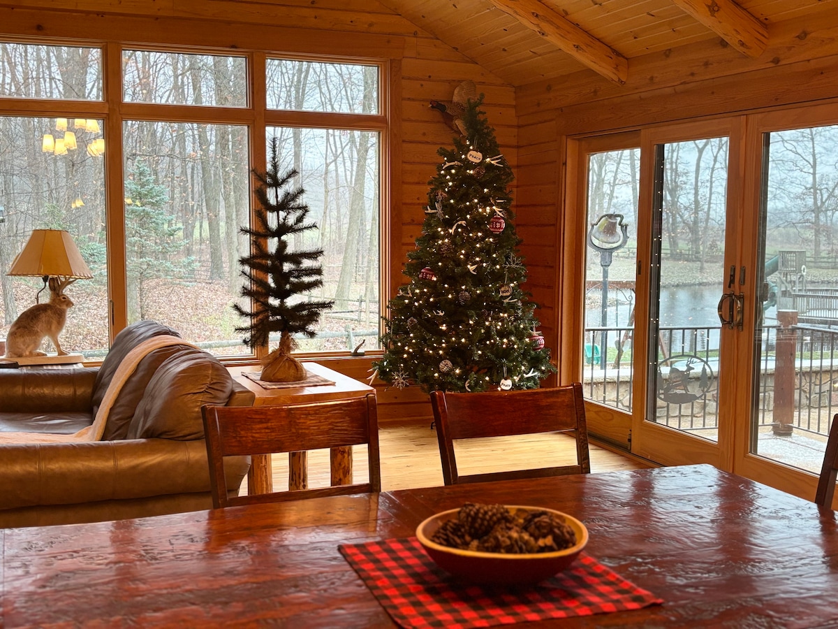 A beautiful log cabin located in Berlin Ohio, the heart of Amish Country. Nestled beside an 8-acre pond with an open dock and adirondack chairs. The outdoors offers other relaxing options like soaking in the hot tub, putting on the putting green, sitting under the pergola with the gas fire pit, swinging on the front porch, or grilling on the patio. Or you can head indoors and relax on the massage chair, play a game, or watch something on one of the 4 TV's, or simply take a nap.