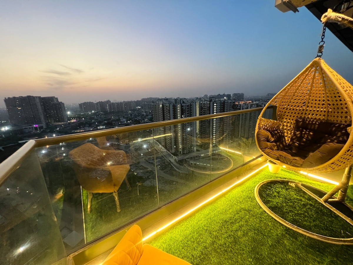 Our newly constructed 2 BHK apartment blends modern comfort with natural charm. The space features 2 serene bedroom with a queen-size beds, a spacious living room, a well equipped kitchen, 2 bathrooms: one attached to the master bedroom and another accessible from the living room and second bedroom and L- shaped balcony offering great view of the city. The property is located near a premium mall in Noida! This well-situated location offers you the convenience of shops, cafes, and entertainment.