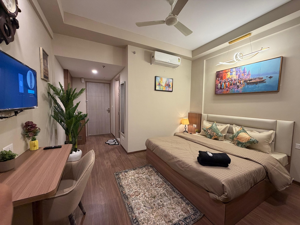 Prime location: Galaxy Blue Sapphire Plaza, Greater Noida King-size bed with luxe linen & elegant bathroom Kitchenette: microwave, kettle, induction, mini fridge Ideal for couples, solo women & business travelers Dining, shopping & entertainment nearby Secure basement parking + 24/7 support