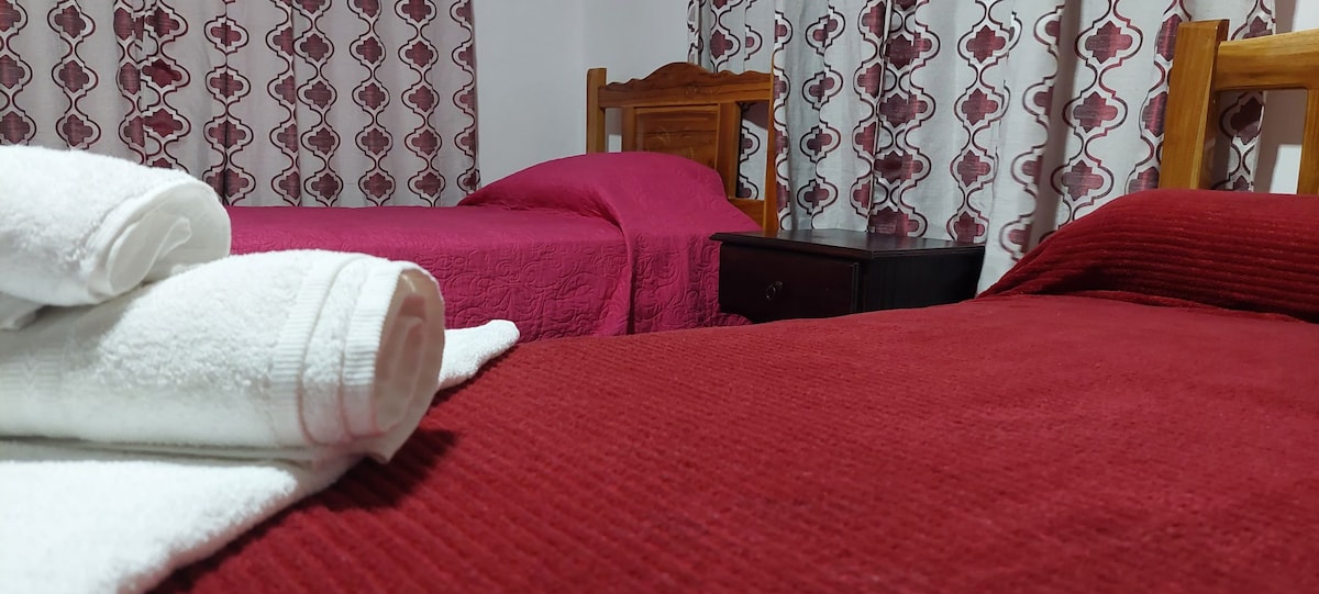 This quadruple room is furnished with one double bed and two twin beds, all with semi-orthopedic mattresses. The room has a WiFi access, a Smart TV, large windows to enjoy the mountain view and a private bathroom. Features: Large windows / Bathroom / Access to rooftop patio with 360° views / Access to kitchen / WiFi / Smart TV / Standing fan / Parking