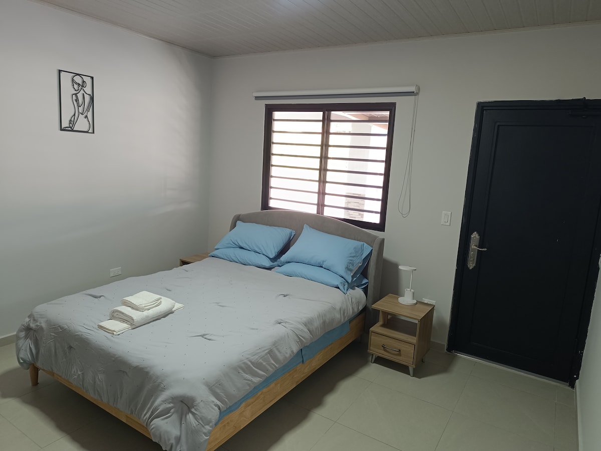Elegante habitación que cuenta con estacionamiento bajo techo, entrada independiente, cama Queen size, almohadas, sabanas, mesitas de noche, área de trabajo, tomacorrientes, wifi Starlink, smart tv 50" (Netflix y Youtube), mini refrigerador, closet, gavetas, cortina blackout, abanico recargable, baño privado, agua caliente, toallas, jabón de cuerpo/manos, basureros y papel higiénico.