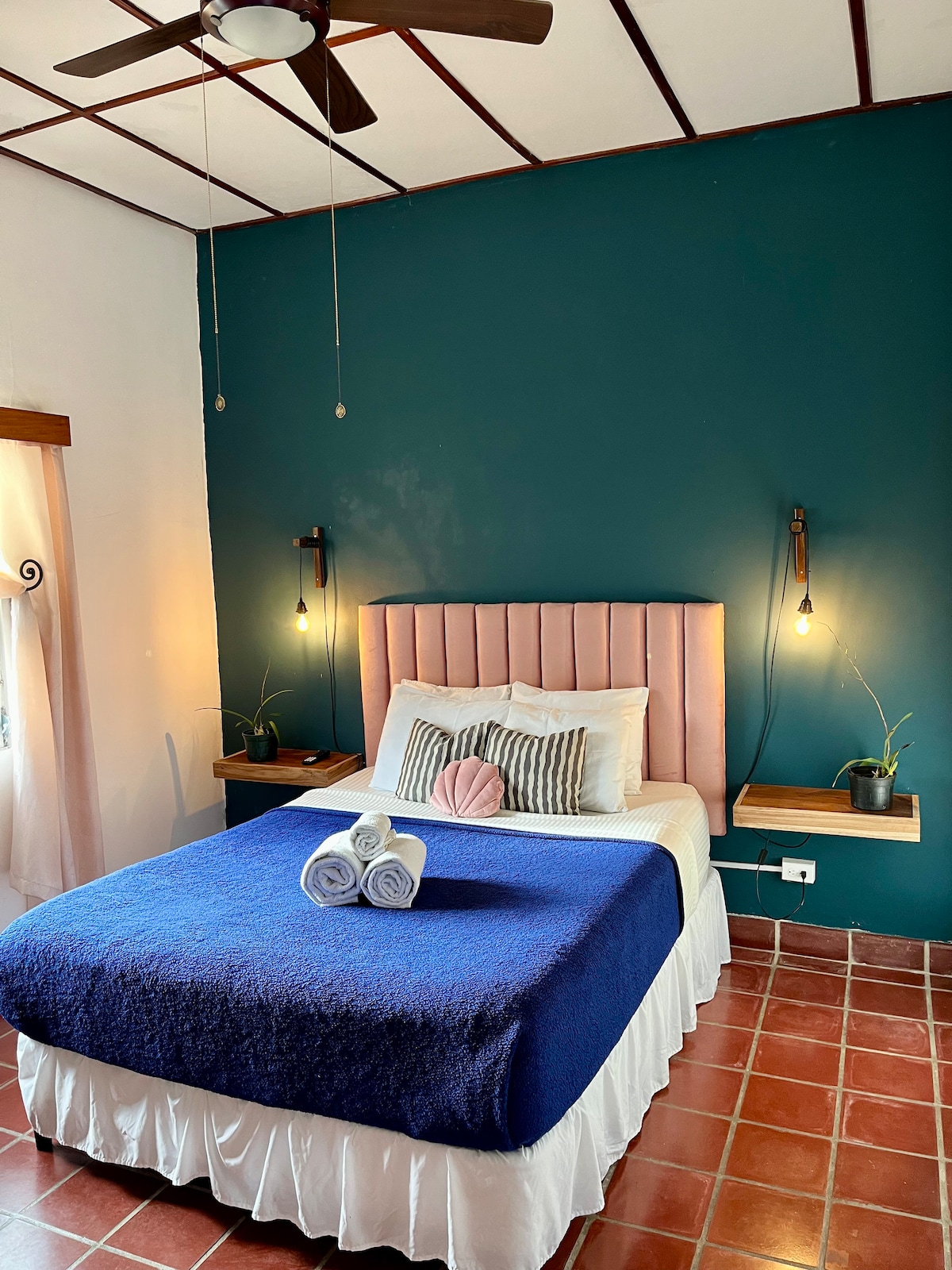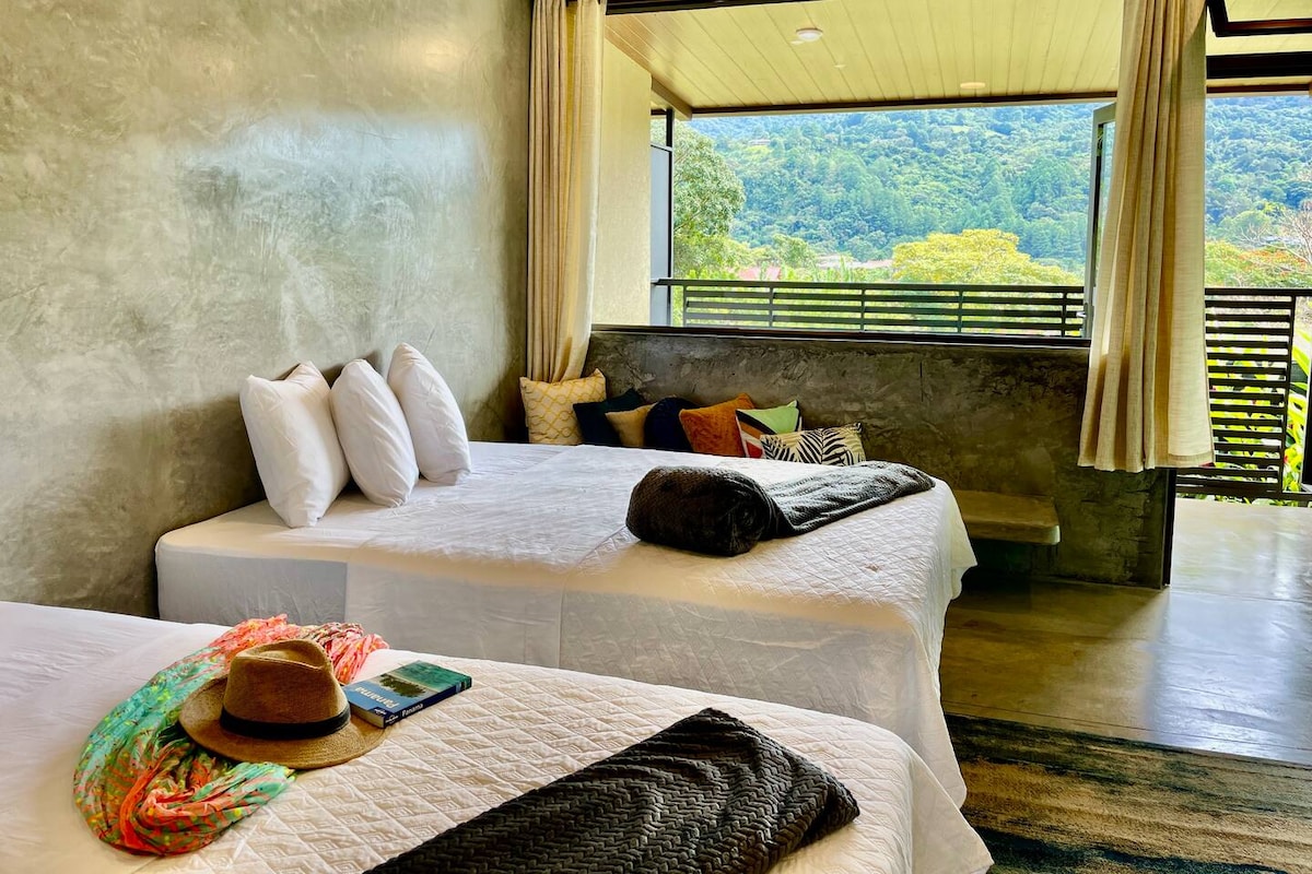 From the 200 sq. ft. open shared terrace on the middle floor, savour your coffee while enjoying the highland getaway and the unique view of the quaint town of Boquete. The loft next to it, has a full kitchenette basic appliances, a small living, dinning and laundry area. The “Butterfly Sanctuary” has a large closet and a double bed. The “Hummingbird Haven” has a queen bed and a LED TV with cable. WiFi: 250Mbps. Access to the loft, terrace and bedrooms is through outside stairs.
