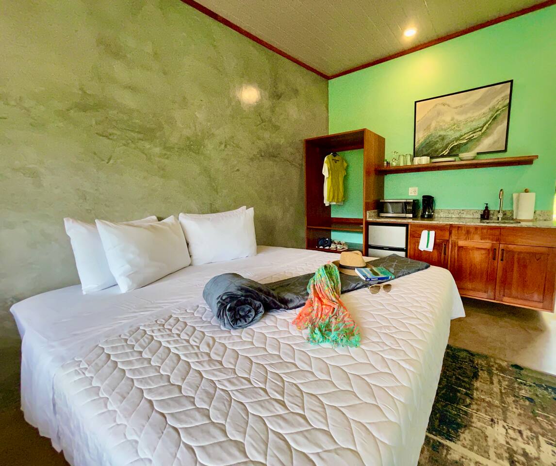 Suite con entrada independiente: estacionamiento techado, cama doble, baño sanitario, cocineta y escritorio. Tu espacio personal en el corazón de David. Cuenta con aire acondicionado tipo split, abanico de techo, TV con acceso a netflix, internet wifi gratis, cortinas black out, tanque de reserva de agua, agua caliente, cocineta equipada con estufa eléctrica, refrigerador, cafetera, microondas y utensilios básicos. No cuenta con lavandería, generador eléctrico y aislamiento acústico.