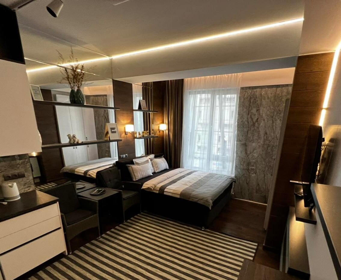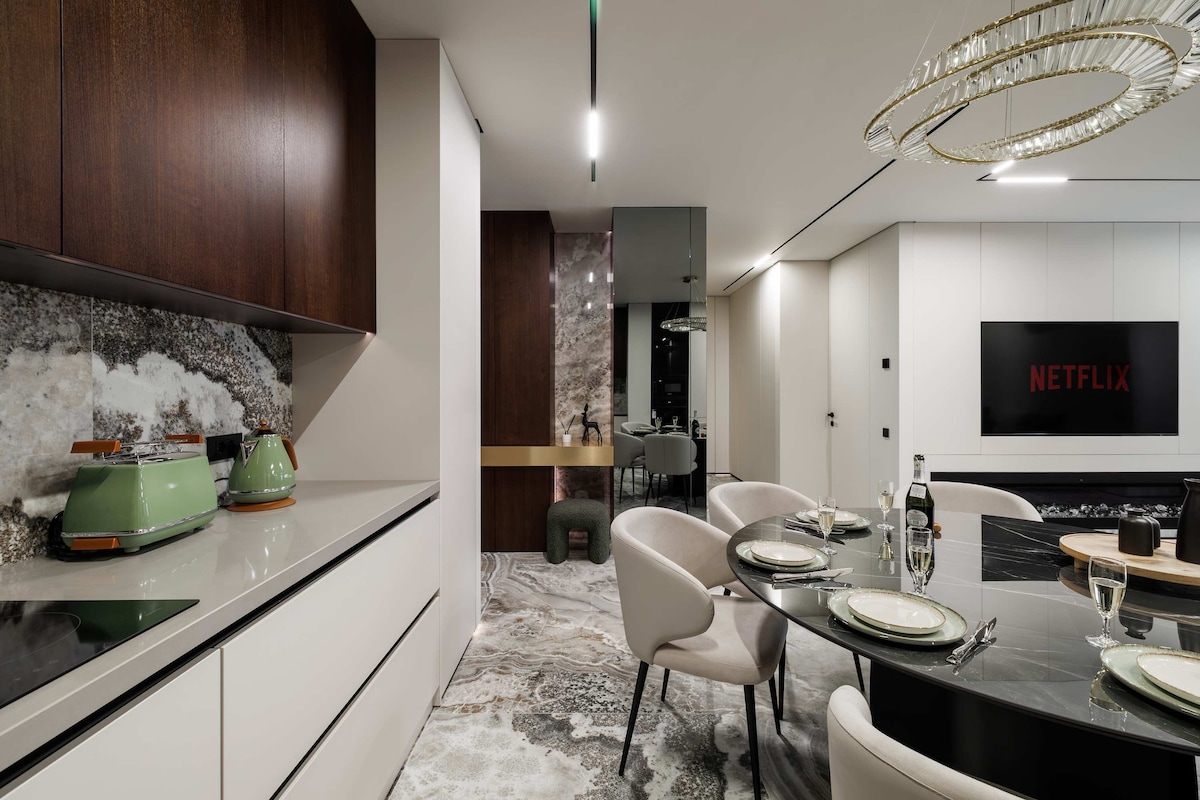 Relaxează-te într-un apartament elegant în inima Chișinăului, cu finisaje din marmură și lemn natural. Te vei bucura de o saltea premium Vi-Spring Bedstead, o cadă spațioasă și un balcon cu șemineu decorativ. Apartamentul are perdele cu telecomandă și espressor cu cafea pe boabe Blocul beneficiază de recepție și pază 24/24, oferindu-ți un plus de siguranță, confort și liniște pe durata întregii șederi.