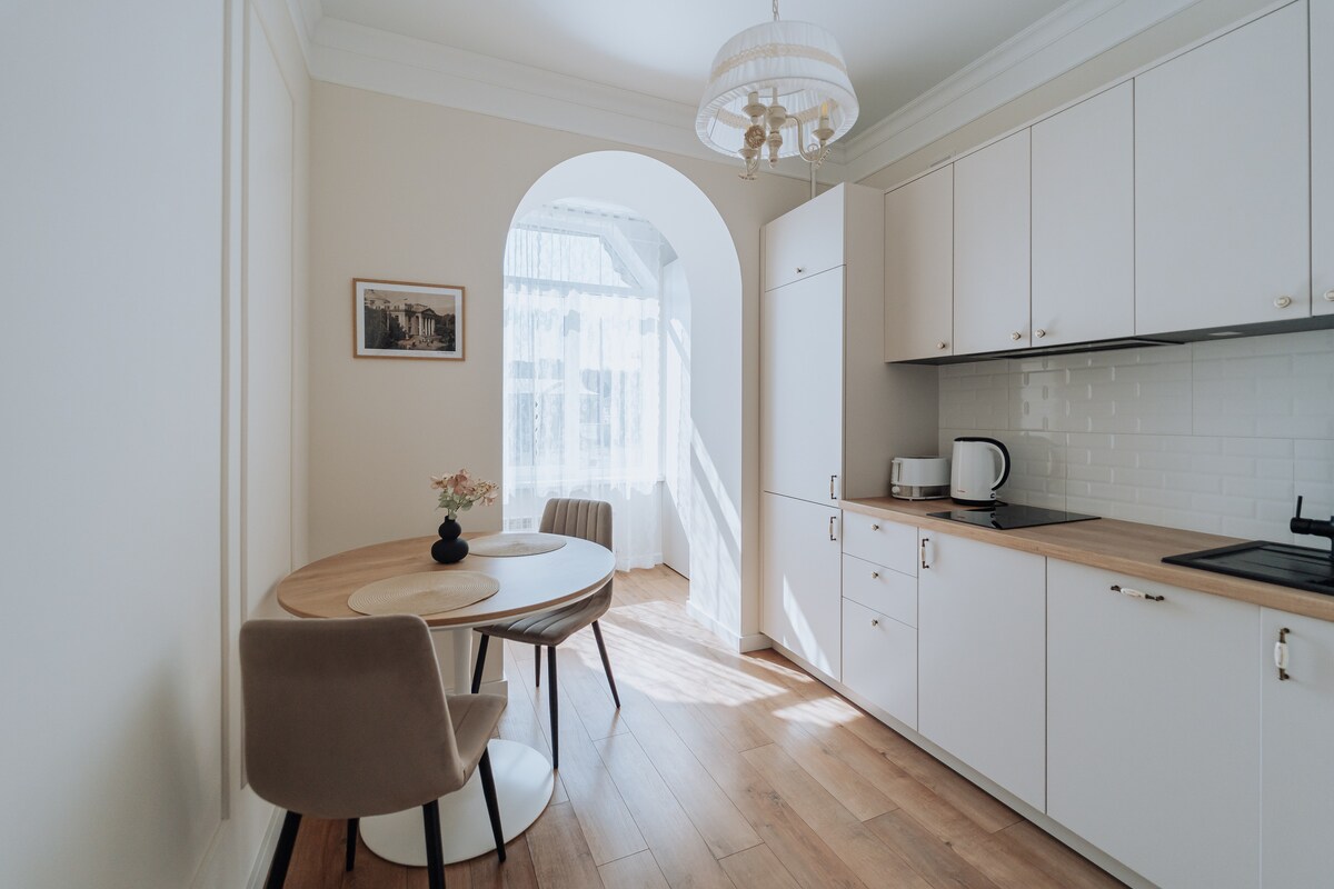 An inviting abode in the heart of the historic city quarter, our place offers easy access to museums and landmarks. Ideal for both travellers and business visitors, we provide a productive workspace with an monitor and a bed featuring an orthopaedic mattress and pillows for relaxation. Immerse yourself in the harmonious Japandi style of our space, seamlessly blending Japanese artistic elements, wabi-sabi philosophy, and Scandinavian hygge. Designed for comfort, simplicity, and sustainability.