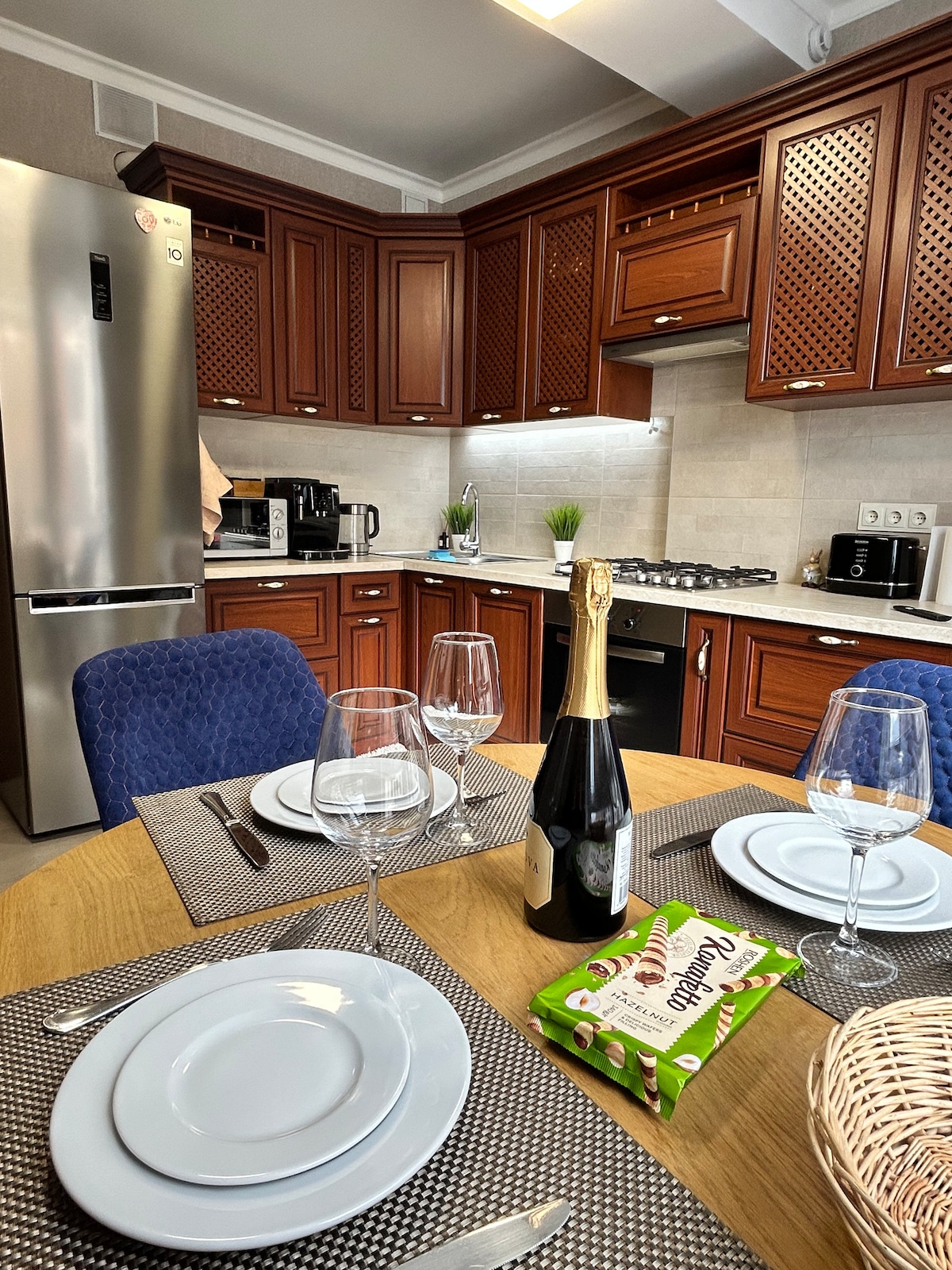 Wine Apartments is a unique experience in the central area. Tradition and history in new, freshly renovated modern apartments. Smart lock 24/7 check-in. Uniqueness and exclusivity: - A collection of more than 60 bottles of select wines from 19 major brands and small family-owned wineries. Each bottle can be purchased at the average market price, tasted and brought as a souvenirs to friends and family. - 60-year-old national carpets from northern Moldova - Big-screen projector with Netflix etc.