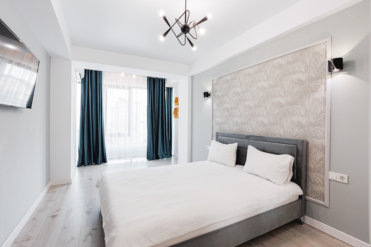 This brand-new apartment is located in a modern building right in the center of Chișinău, within walking distance of the Central Park. The space comfortably accommodates up to 4 guests, featuring a bedroom with a double bed and a living room with an expandable couch. Amenities include: • High-speed Wi-Fi – perfect for remote work • Air conditioning to keep you cool during warm days • Fully equipped kitchen • Washing machine • Private balcony to enjoy your morning coffee