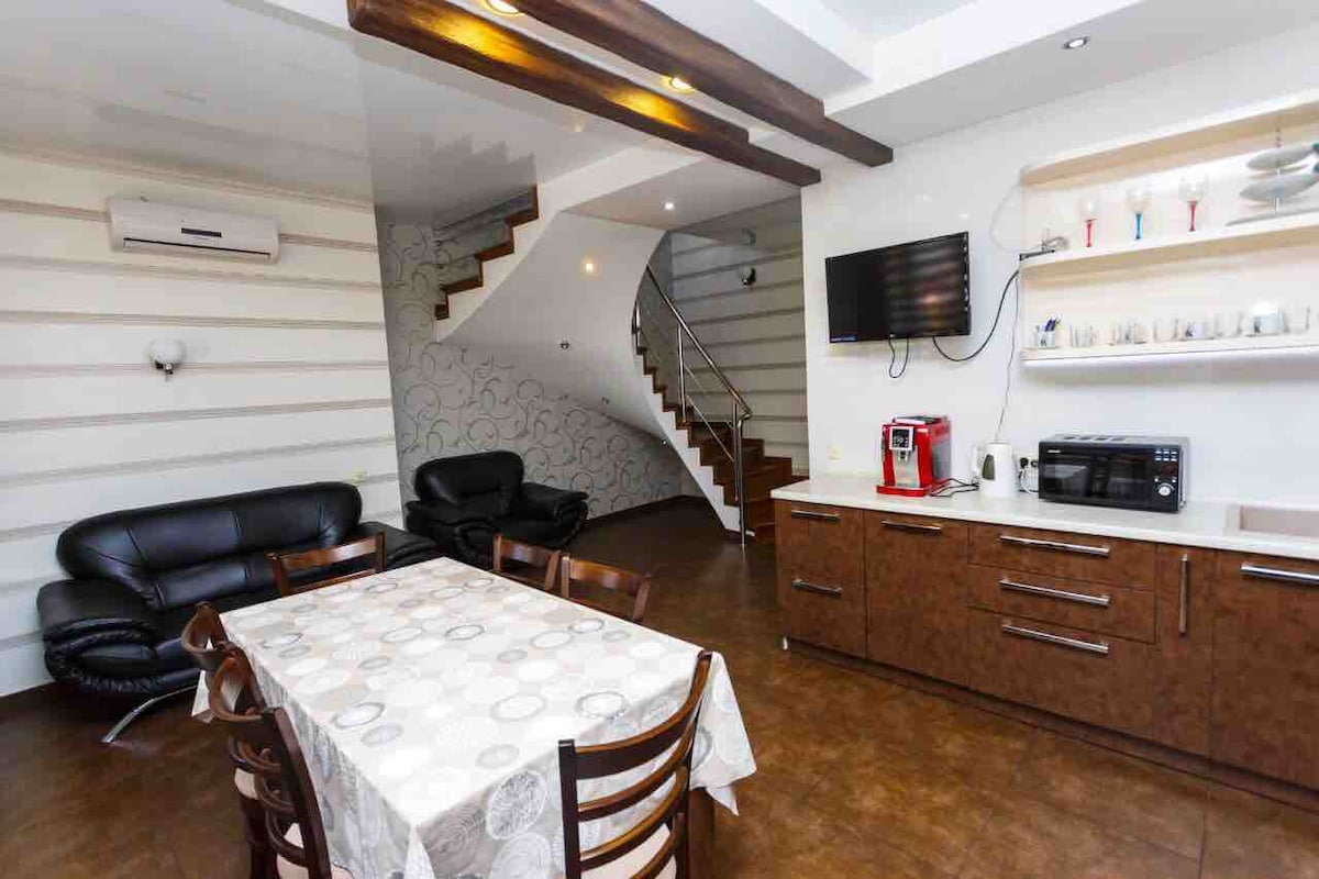 Dear guests and travelers, I'm offering to your attention a recently built house located in the heart of Chisinau, near the famous Radisson Blu hotel and The Central Park. The 2 floored house offers enough space for a pleasant stay, being able to host maximum 5 persons. In the house you will find 2 separate bedrooms, a well equiped kitchen, 2 bathrooms, a balcony for smokers, fast internet conexion and a parking space. The house is perfect for relaxation,but also for business trips.
