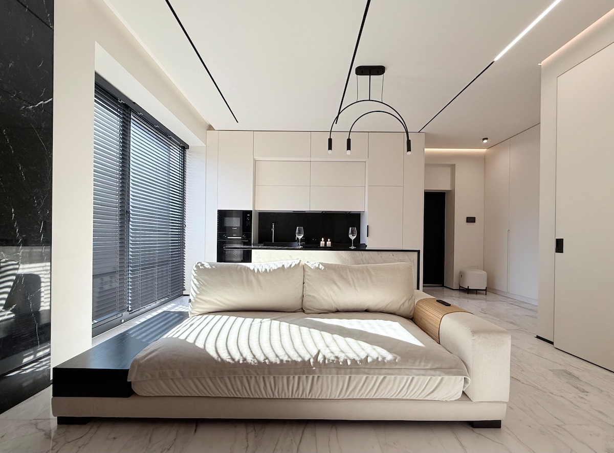Enjoy a stylish experience at this centrally-located place. Brand new apartment located right on Stefan cel Mare street, in front of Ministry of Internal Affairs. Fully equipped for your comfort and styled in minimalist design, it will make you feel like home. It is at the 2nd floor, all windows are facing the main street, displaying a beautiful and pleasant city view, meanwhile offering the maximum noise reduction with our blackout electrical blinds and triple glass windows.