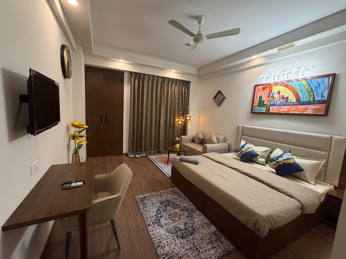 Fully furnished luxurious studio apartment with all modern amenities available in Greater Noida near Metro station. Luxurious , Specious and Couple friendly studio in Greater Noida Near Expo Mart. What You’ll Love: ✔ Unique Interior – Enjoy the Mesmerizing Interior. ✔ Modern Comfort – A beautifully furnished space with a comfy bed, cozy seating, and stylish decor. ✔ Fully Equipped Kitchen – Cook your favorite meals with ease. ✔ Fast WiFi & Smart TV – Stay connected and entertained.