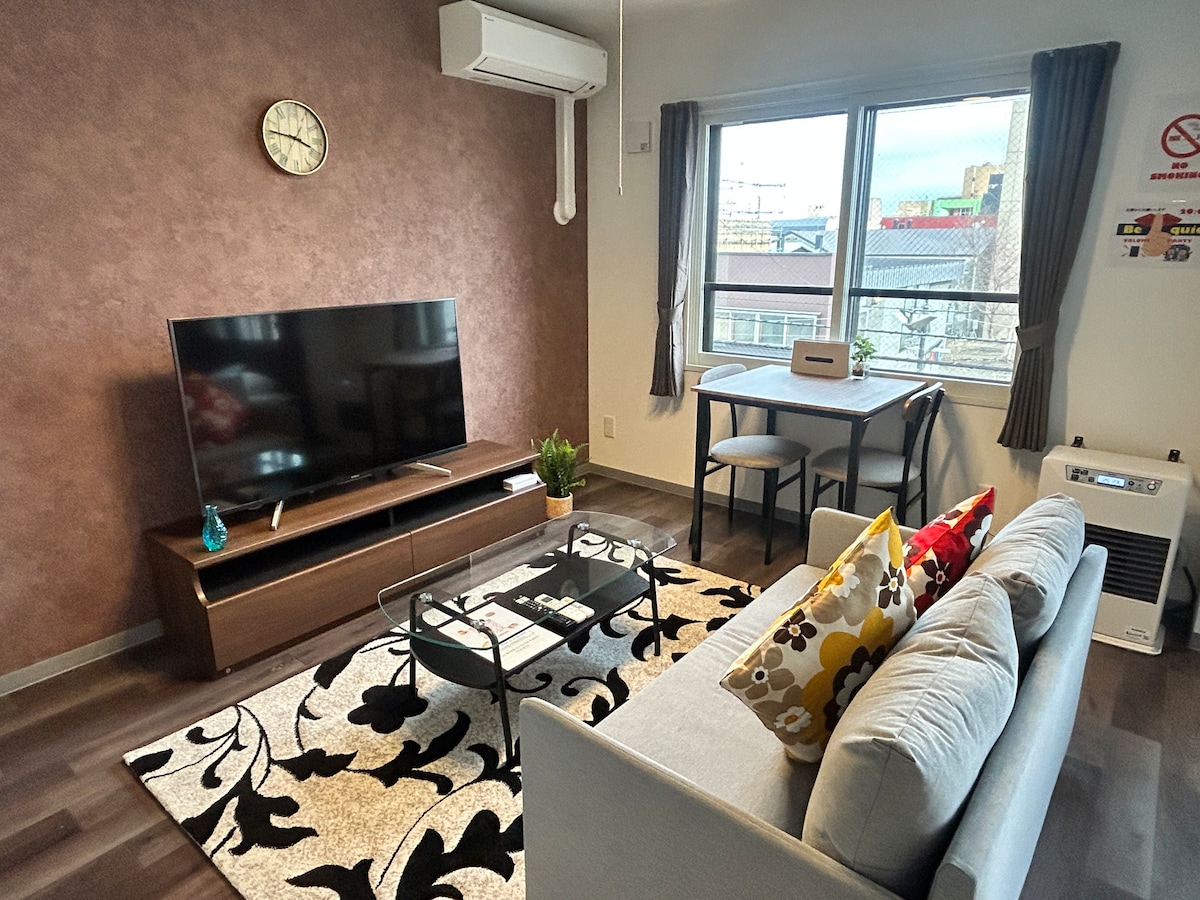 新千歳空港・札幌方面へのアクセス抜群! JR千歳駅から徒歩10分、飲食店がひしめく人気エリア「幸町(さいわいちょう)」に位置する、新築のプライベートアパートメントです。 ■ロケーション:グルメな夜を楽しむならココ! 幸町は、地元民にも愛される飲食店の宝庫です。 徒歩圏内に名店多数: 北海道名物のジンギスカン、新鮮な寿司、〆のラーメン、賑わう居酒屋などがすぐそばに!夜遅くまで北海道グルメを満喫しても、歩いて帰れる安心の立地です。 ■お部屋の魅力(最大4名様) 2025年オープンの清潔感あふれる空間です。 快適な設備: シングルベッド2台に加え、ソファベッド、お布団をご用意。カップルからご家族まで対応可能です。 長期滞在も安心: IHコンロ付きキッチン、調理器具、洗濯機(洗剤付き)を完備。自分の家のように快適にお過ごしいただけます。 ■周辺環境 コンビニやスーパーも近くにあり、買い出しにも困りません。 「食べて、飲んで、すぐ休める」最高の立地で、北海道の旅をスタートさせませんか?皆様のご予約をお待ちしております!
